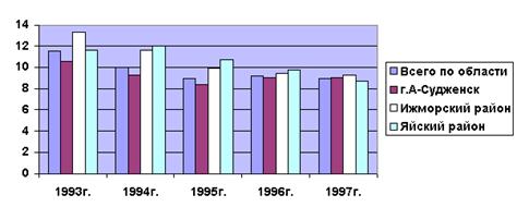 Самый высокий уровень смертности в 1997 г. на 1000 человек населения наблюдался в сельских советах: Анжерском (28.3) , Улановском (22.6) , Ишимском (20.4).