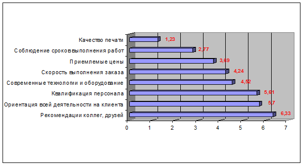 - Качество печати играет решающую роль при выборе компании, при этом очень важно соблюдение сроков выполнения заказа. Рекомендации коллег, друзей, предыдущий опыт работы и ориентация всей деятельности на клиента оказывают меньшее влияние на выбор компании, предоставляющей услуги рекламной полиграфии (см. рис. А.3).