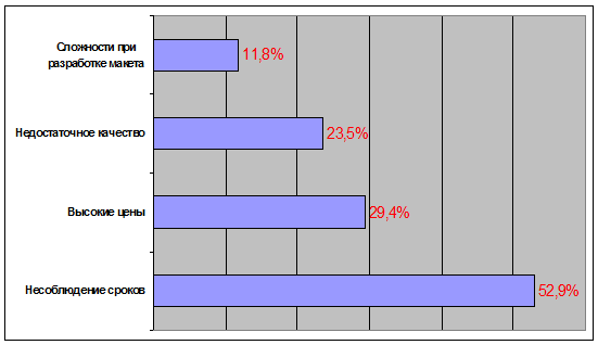 · Одной из главных проблем для рекламных агентств при работе с компаниями, предоставляющими услуги полиграфии является несоблюдение сроков выполнения работ последними (см. рис. А.4).