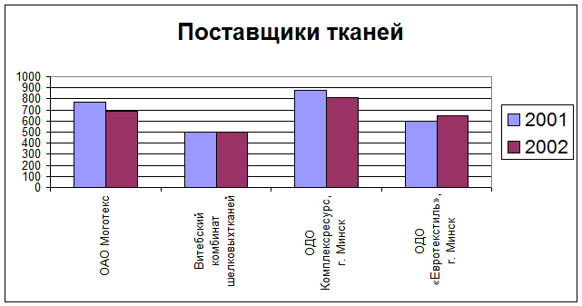 Основным поставщиком тканей является ОДО «Комплексресурс», расположенный в г. Минске. Однако в 2002 году поставки от данного предприятия снизились на 1,31%. Поставки от ОАО «Моготекс» также снизились на 2,01% и составили 26,04% от уровня прошлого года. Основным поставщиком бязи и диагонали является ОДО «Евротекстиль». Все ткани от этого поставщика импортного производства. Поставки в 2002 году от данного поставщика увеличились на 2,67%. Снижение поставок от ОАО Моготекс и увеличение от ОДО «Евротекстиль» связано с качеством и конкурентоспособностью тканей. Импортные ткани отличаются от отечественных тем, что они в большей мере отвечают требованиям моды. А многие покупатели и особенно покупательницы при покупке тканей в первую очередь отдают предпочтение наиболее модной ткани.