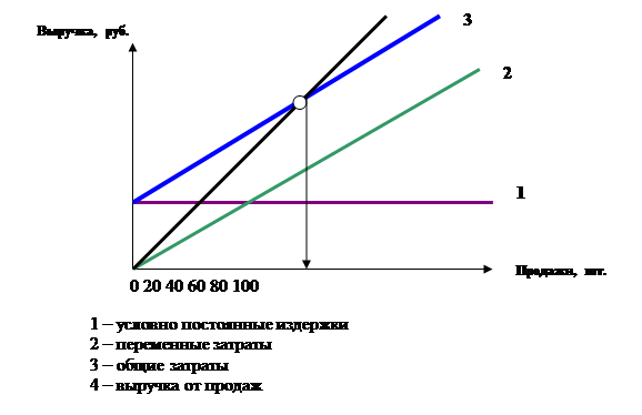 2. Оценка точки безубыточности. Анализ точки безубыточности является логическим продолжением использования метода покрытий. Точка безубыточности показывает взаимосвязь между выручкой от реализации товара, затратами и прибылью. При помощи неё можно определить критическую величину продаж, когда получаемая выручка начинает покрывать затраты предприятия. Кроме этого, точка безубыточности показывает количественные ориентиры производства и продаж товаров.