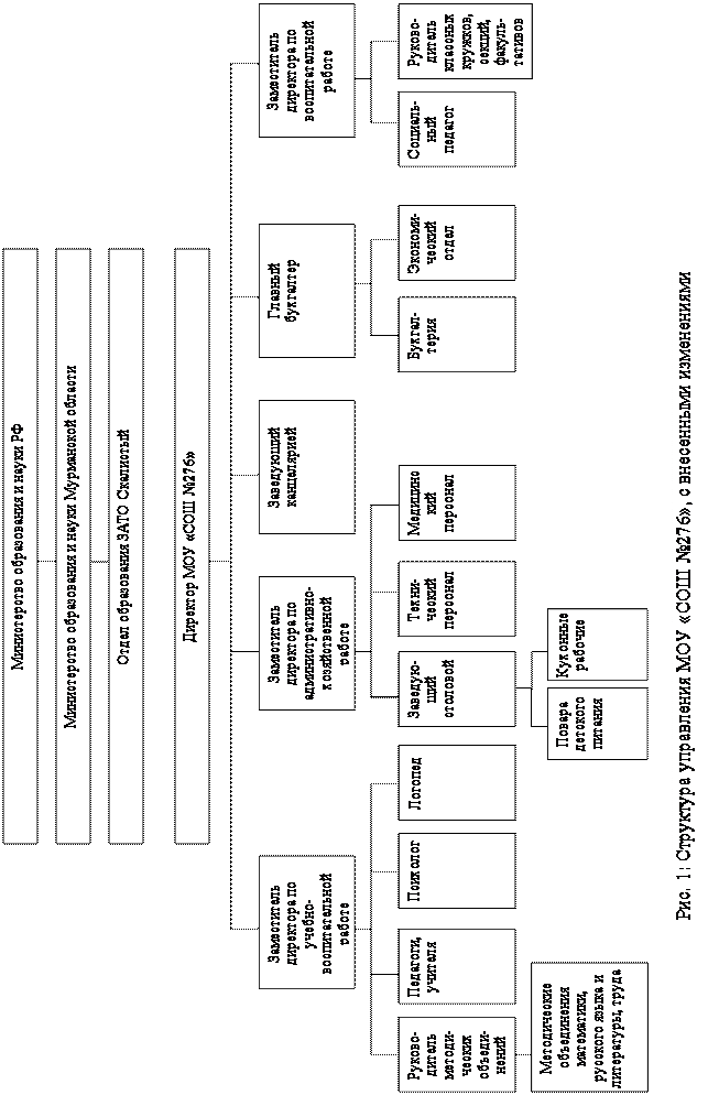 Проанализировав подробнее данную организационную структуру, я увидела следующий недостаток: поставив перед собой одной из основных задач создание условий охраны и укрепления здоровья обучающихся, в организационной структуре МОУ «СОШ № 276» отсутствует медицинский персонал. Чтобы не увеличивать непосредственных подчинённых директора, можно поставить работников медицинского обслуживания в подчинение заместителя директора по административно-хозяйственной работе.