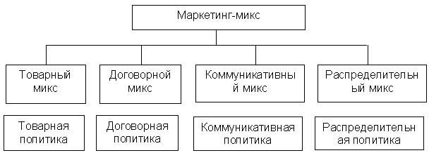 В наиболее часто употребляемой форме маркетинг-микс включает четыре субмикса маркетинга. Это — товарный микс; договорный микс; коммуникативный микс; распределительный микс (рисунок 1.1). Каждый субмикс включает самостоятельный комплекс мероприятий, проведение которых формирует соответствующую политику в сфере маркетинга (таблица 1.1) [6, c. 72].