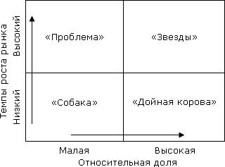 Для оценки конкурентоспособности отдельных видов бизнеса используются два критерия: темп роста отраслевого рынка, относительная доля рынка. Темп роста рынка определяется как средневзвешенное значение темпов роста различных сегментов рынка, в которых действует предприятие, или принимается равным темпу роста валового национального продукта. Темпы роста отрасли 10% и более рассматриваются как высокие. Относительная доля рынка определяется делением доли рынка рассматриваемого бизнеса на долю рынка крупнейшего конкурента.
