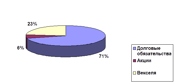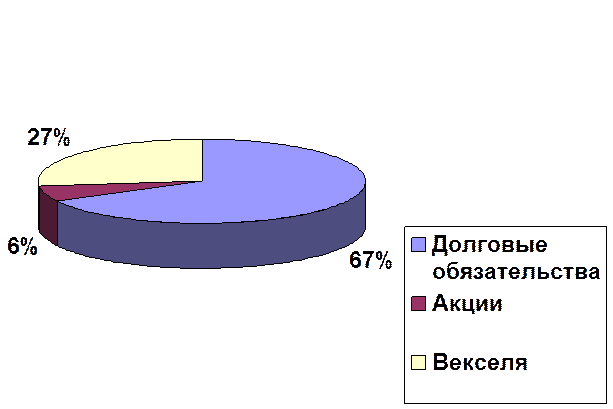 Как можно заключить из исходных данных, в 2001 году происходило увеличение суммы вложений кредитных организаций РФ в ценные бумаги, так что на 1 января 2002 г., по сравнению с прошлогодним результатом, их абсолютные величины выросли по всем показателям: объем вложений увеличился на 81,1 млрд. руб. При этом иерархия осталась неизменной: на первом месте вложения в долговые обязательства, затем - в векселя, а на третьем месте – акции. Однако, несмотря на сохранность иерархической структуры, в 2002г. в процентном соотношении вложений все же произошли изменения: сократились вложения в долговые обязательства на 3,7%, возросла доля векселей – на 3,5%, а доля акций осталась почти неизменной (изменилась всего на 0,2%).