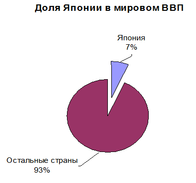 ВВП Японии составляет более 4 млрд. долл. (2002 г.), ВВП на душу населения – около 32 тыс. долл. в год – один из самых высоких показателей в мире. В Японии производится свыше 10% мировой промышленной продукции. На Японию приходится 70% совокупного продукта Восточной Азии, её валовой внутренний продукт (ВВП), подсчитанный на базе текущих валютных курсов, в четыре раза превышает ВВП Китая. Она достигла высокого технического совершенства, особенно в отдельных направлениях передовых технологий. Нынешние позиции Японии в Мировом хозяйстве – результат её экономического развития во второй половине прошлого столетия.