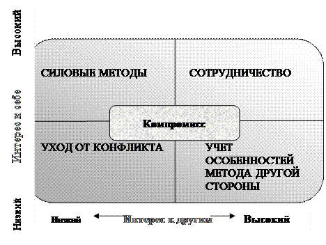 После этого выбирается оптимальная стратегия разрешения конфликтной ситуации: уход от конфликта, силовые методы, стиль сотрудничества, стремление войти в положение другой стороны, стремление к компромиссу