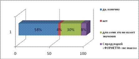 На основе проведенного исследования можно сделать вывод, что торговая марка «Форнетти» является одной из наиболее популярных в сфере быстрого питания. Для нее характерна стратегия одной торговой марки, то есть выпуск широкого ассортимента продукции под одним названием. В своей деятельности «Форнетти» придерживается стратерии массового маркетинга, не выделяя определенного сегмента рынка. Вместе с тем следует отметить, что основную группу потребителей составляет молодежь. В это же время существуют сегменты, не имеющие представления о данной торговой марке, что является существенным недостатком маркетингового микса.