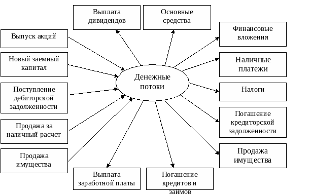 Рисунок 1.1 − Денежные потоки предприятия 2. По методу исчисления объема: валовой денежный поток − это все поступления или вся сумма расходования денежных средств в анализируемом периоде времени; чистый денежный поток (ЧДП) представляет собой разность между положительным (ПДП) и отрицательным (ОДП) потоками денежных средств в анализируемом периоде времени:
