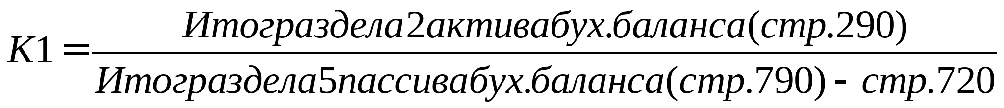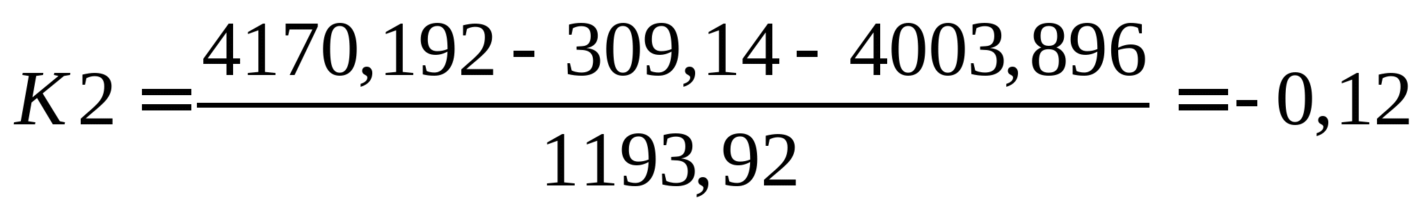 Таблица 2.1 - Анализ платежеспособности организации | № | Наименование показателя | На нач. периода | На конец периода | Норматив коэффициента | Изменения, + /- | | За период | По сравнению норматива коэффициента с коэффициентом предыдущего периода | По сравнению норматива коэффициента с коэффициентом отчетного периода | | 1 | 2 | 3 | 4 | 5 | 6 | 7 | 8 | | 2 | Коэффициент текущей ликвидности (К1) | 0,89 | 1,13 | 1,0 | 0,24 | 0,11 | -0,13 | | 3 | Коэффициент обеспеченности собственными оборотными средствами (К2) | -0,12 | -0,6 | 0,1 | -0,48 | 0,22 | 0,7 | | 4 | Коэффициент обеспеченности финансовых обязательств активами (К3) | 0,26 | 0,3 | 0,85 | 0,04 | 0,59 | 0,55 |