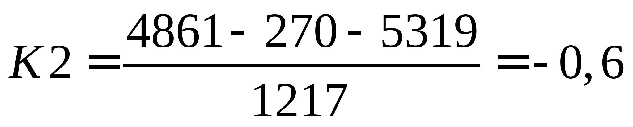 | | 5 | Изменение остатков краткосрочных кредитов и займов с процентами, кредиторской задолженности, долгосрочных кредитов и займов за отчетный период (форма №1 стр. 710 (на конец года минус на нач. периода) + стр. 720 (на конец минус на начало периода) + стр. 730 (на конец минус на начало периода) ) по бухгалтерскому балансу | − | 797 | − | | 6 | Обобщающий коэффициент платежеспособности по ден. потокам Кпдг = (стр.1 + стр.2) / (стр.3 + стр.4 + стр.5) = 1 или > 1 или < 1 | − | 0,97 | − | | 7 | Обеспеченность ден. средствами расходов (сформированной с/с, коммерческих и управленческих расходов, налогов и платежей из реализации и прибыли в течение отчетного периода, изменение остатков краткосрочных обязательств, долгосрочных кредитов и займов (на конец года - на начало периода)) Оаг = (стр.1 + стр.2) - (стр.3 + стр.4 + стр.5), млн. руб. | − | - 271 | − |