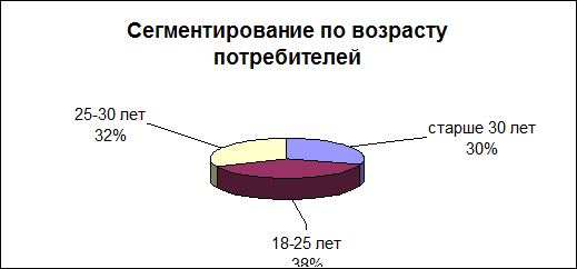 При анализе сегментирования потребителей по возрасту получили следующую информацию о потребителях. Люди в возрасте 18-25 лет - это в основном учащиеся высших учебных заведений. Данная группа потребителей в большинстве случаев ведет активный образ жизни, и большое количество времени проводят в движении. Люди, чей возраст определяется границами 25-30 лет, уже имеют определенную профессию и привычки. Они задумываются о своем здоровье, и будут меньше времени проводить за компьютером. Кроме того, данная группа потребителей не так многочисленна, как первая. Возрастная группа старше 30 лет характеризуется тем, что в большинстве случаев не следует за прогрессом, и в силу своей привычки используют для работы проверенные торговые марки, поэтому новинки их не интересуют. Ассортиментный ряд ООО «Мелодия» включает товары подходящие для каждой возрастной группы. Так студентам подойдут DVD-диски, людям от 25 до 30 – МР3-плееры, группе старше 30ти – домашние кинотеатры.