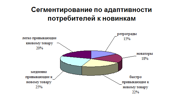 При анализе сегментирования потребителей по адаптивности к новому товару можно отметить, что 18% - новаторы – лица, склонные к риску и «эксперименту», с высоким социальным статусом и высокими доходами. Быстро привыкающие к новому товару (22%) характеризуются меньшей склонностью к риску и ведут активную общественную жизнь. Поэтому данные группы, скорее всего, будут покупать дорогие товары импортного производства. Легко привыкающие к новому товару (20%) - это большие группы людей, отличающиеся средним уровнем доходов, одобряющие изменения. Именно на данную группу населения будет ориентироваться организация при продаже своего нового товара. Медленно привыкающие к новому товару (25%) характеризуются осторожностью, склонностью подражать, консерватизмом, приверженностью к определенным маркам. Ретрограды (15%) - это крайний тип потребителей с отрицательным отношением к любым изменениям, без воображения, реагирующие на товар тогда, когда он находится на рынке в течение длительного времени. Эти группы потребителей так же откажутся от покупки новых товаров, так как отличаются постоянством, как в поведении, так и в привычках. Итак, в соответствии с выбранными целями по расширению товарного ассортимента ООО «Мелодия» основной упор сделает на сегмент потребителей, легко привыкающих к новому товару, так как он наиболее перспективный.