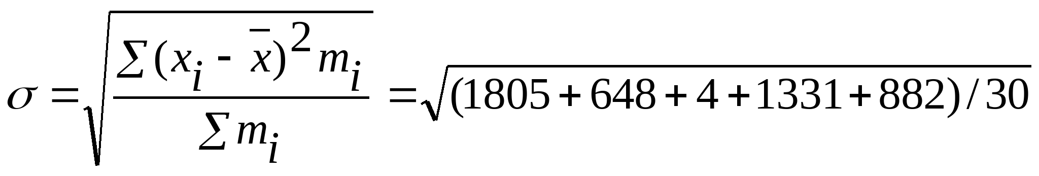 2. Xвзв.гарм.= = 30 / (5/25 + 8/35 + 4/45 + 11/55 + 2/65) = 40.095 3. Xвзв.квадр.= =((252*5 + 352*8 + 452*4 + 552*11 + 652*2) / 30)Ѕ = 45,735