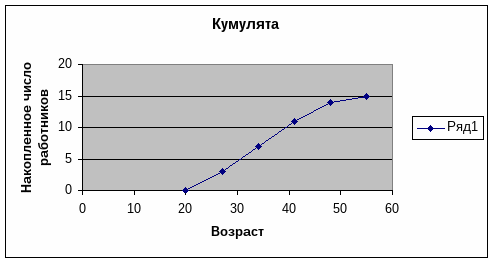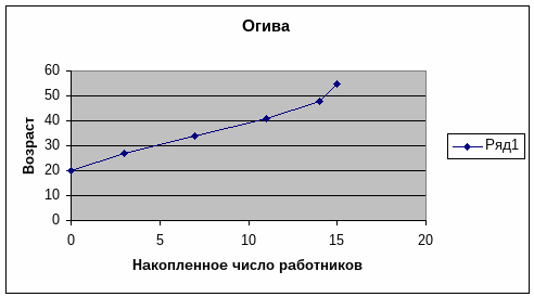 РЕШЕНИЕ: Расчитаем количество групп по формуле Стерджесса:( n = 1 + 3,322 * lgN) , где n - число групп; N - количество единиц исследуемой совокупности. N = 1 + 1.322 * lg15 = 5 Расчитаем шаг: h= (55 – 20) / 5 = 7 Теперь строим вариационный ряд: | № | Группа работников по возрасту | Число работников с данным возрастом | Накопленное число работников | | 1 | 20 – 27 | 3 | 3 | | 2 | 27 – 34 | 4 | 7 | | 3 | 34 – 41 | 4 | 11 | | 4 | 41 – 48 | 3 | 14 | | 5 | 48 – 55 | 1 | 15 |
