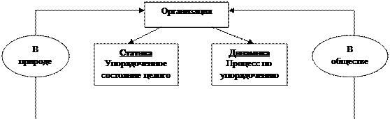 Все это говорит о том, что организация может рассматриваться в статике и динамике. В статике – это некоторое целостное образование, которое имеет вполне определенное предназначение. В динамике она представляет собой разнообразные процессы по упорядочению элементов, формированию и поддержанию целостности вновь создаваемых или функционирующих природных объектов. Эти процессы могут состоять из целенаправленных действий людей, и тогда можно говорить об организации как функции управления, либо состоять из естественных физических процессов, т. е. иметь самоорганизующееся начало. Понимание термина «организация» в статике и динамике проиллюстрировано на рис.1.