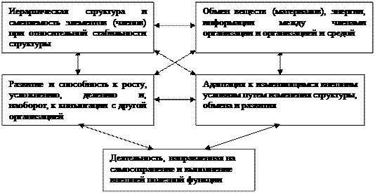 Любая организация требует постоянных организационных усилий по ее сохранению, поддержанию и развитию. Процессы организации не прекращаются с появлением объекта организации. Поэтому разделение на процесс и результат часто условно. Всякая организация, имеющая цель и способная к актам выбора и решения на пути к этой цели, представляет собой сложную динамическую систему со всеми присущими ей свойствами (рис. 2). В этом отношении многие организации сходны с живыми организмами. Для них характерны зарождение, рост и развитие. Им необходим постоянный обмен веществом, энергией и информацией с окружающей средой. Они имеют систему управления, основанную на обратных связях, которая обеспечивает внутренние взаимодействия и целесообразное поведение. Потребность (инстинкт) самосохранения заставляет их избегать опасных обстоятельств или защищаться от повреждающих влияний. Тем самым они ведут борьбу за существование. Они постоянно адаптируются к изменению внешних условий. Они склонны к образованию родственных сообществ. Они болеют, стареют и умирают…