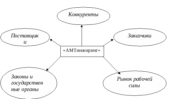 В основе выбора и обоснования стратегии развития организации положен анализ факторов внешней и внутренней среды, позволяющей определить сильные и слабые её стороны, соответствующие угрозы и возможности развития организации. Анализ факторов внешней среды дает возможность выявить особенности социально-экономической среды, взаимодействие с которой оказывает прямое или косвенное воздействие на организацию.  Среда прямого воздействия на СООО «АМТинжиниринг» На деятельность организации большое влияние оказывают воздействия конкуренты. Это связано с тем, что данный вид деятельности предназначен для определенного круга потребителей. На данный момент в городе Минске функционирует 3 организации, которые производят аналогичную продукцию. Изменение цен у конкурентов либо технологии производства продукции существенно скажется на деятельности СООО «АМТинжиниринг». Это связано с тем, что у потребителей данной отрасли есть выбор сотрудничества с той или иной организаций и принятие более выгодных условий. Наиболее серьезным конкурентом является Минский завод автоматических линий. Особого преимущества у этого завода перед СООО «АМТинжиниринг» в производстве автоматических линий нету так как СООО «АМТинжиниринг» не уступает по качеству другим аналогичным конкурентам. Поставщики оказывают непосредственное влияние на деятельность организации. Это влияние может заключаться в следующем: отказ сотрудничества с данной организацией и переход к фирме-конкуренту; задержка поставки продукции на длительный срок; повышение цен на свою продукцию, поставка продукции низкого качества. Все это приведет к торможению производственного процесса, к потере большого количества заказов и постоянных заказчиков, к увеличению издержек производства. Основными поставщиками материалов и комплектующих СООО «АМТинжиниринг» являются Россия (черные металлы), БСЗ ЗАО «Атлант» », УП «Мзор», ОСП Комплекс «Центр-5» УП НПО «Центр», ОАО «Минский ПКТИ», ОАО «МПОВТ». На СООО «АМТинжиниринг» сформировался определенный круг постоянных заказчиков, которые сотрудничают с данной организацией уже на протяжении долгих лет. Заказчики также оказывают влияние на деятельность организации. В 1999 году, когда только начал функционировать СООО «АМТинжиниринг», фирм, занимающихся данным видом деятельности, было очень мало. Поэтому количество потребителей предоставляемой продукции СООО «АМТинжиниринг» было много. Со временем число фирм данной отрасли росло и, следовательно, количество заказчиков уменьшалось, которые имели возможность выбора. Основные характеристики продукции, на которые обращает внимание заказчик при выборе фирмы-изготовителя необходимой продукции: это качество продукции, цена, спектр дополнительных услуг. Уменьшение числа потребителей продукции СООО «АМТинжиниринг» приведет к уменьшению размеров деятельности организации, выпуска продукции, снижению прибыли, увеличению издержек, снижению конкурентоспособности продукции. Основными заказчиками СООО «АМТинжиниринг» являются США (ЕRS Engineering Согр.) и Россия (Металл Профиль), другие пивоваренные компании России и Белоруссии.  Среда косвенного воздействия на СООО «АМТинжиниринг» Состояние экономической среды имеет первостепенное значение для деятельности организации. Необходимо постоянн