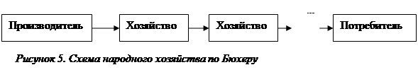 При этом Бюхер вводит принципиально важный критерий классификаций форм экономического развития: длина того пути, который должен пройти предмет отпроизводителя к потребителю в рамках каждой формы. Причем речь здесь не столько о времени, за которое продукт проделывает этот путь, о количестве его владельцев, которое он меняет на этом пути. Иногда предмет переходит от одного владельца к другому дольше, чем через пятерых владельцев, но «длина пути» в бюхеровском понимании во втором случае больше.