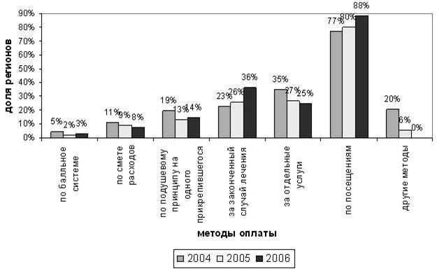 Рис.1. Применение оплаты по посещениям в 2004-2006 гг. в %