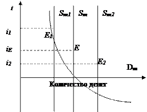 У каждого способа размещения сбережений есть свои достоинства и недостатки. Деньги не приносят дохода, но абсолютно ликвидны, т.е. могут сразу и без всяких затрат быть использованы для покупок и платежей. Ценные бумаги (например, государственные облигации) приносят устойчивый доход в виде процента, но менее ликвидны. Необходимо время, а возможно и деньги, чтобы превратить их в платёжное средство. Существует и определённый риск, связанный с изменениями курса ценных бумаг. Выбор между деньгами и облигациями и определяет колебания процентной ставки. Повышение уровня процентной ставки приводит к росту спроса на облигации и соответственно (при фиксированном объеме сбережений) сокращению спроса на деньги. И наоборот, снижение уровня процентной ставки сопровождается сокращением спроса на облигации и ростом спроса на деньги. Таким образом, существует обратная зависимость между спросом на деньги (как средство сохранения богатства) и движением процентной ставки. Графически эта зависимость изображена на (рис. 2) [8, стр.433]