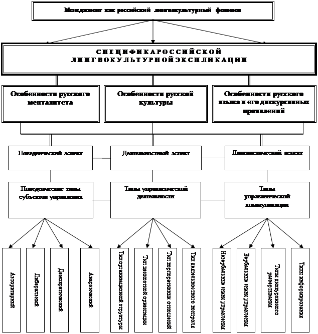 Для управленческой коммуникации естественной представляется встраивание в инокультуру в рамках межкультурной адаптации. Менеджмент компании, которая намеревается вести бизнес за пределами своей страны (в экономическом пространстве инокультуры), накапливает информацию о деловой культуре народа чужой территории, ищет средства и пути ее применения для выгодного ведения своего бизнеса, вырабатывает стратегии с учетом того знания, которое составляет его долгосрочный экономический интерес. В лингвистическом отношении управленческое поведение внедряющейся деловой культуры сводится к освоению тех особенностей местного речевого поведения, которые способствовали бы успешной реализации управленческого процесса на чужой территории. Данное обстоятельство ведет к проявлению этнокультурной специфики структурного содержания самого концепта «менеджмент» и его субконцептов. Описанию проявления этой специфики посвящена следующая глава диссертации (см. главу ).