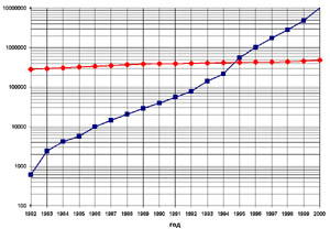 ычислительная биология, она же биоинформатика, она же компьютерная генетика - молодая наука, возникшая в начале 80-х годов на стыке молекулярной биологии и генетики, математики (статистики и теории вероятности) и информатики, испытавшая влияние лингвистики и физики полимеров. Толчком к этому послужило появление в конце 70-х годов быстрых методов секвенирования* последовательностей ДНК*. Нарастание объема данных происходило лавинообразно (рис. 2) и довольно скоро стало ясно, что каждая полученная последовательность не только представляет интерес сама по себе (например, для целей генной инженерии и биотехнологии), но и приобретает дополнительный смысл при сравнении с другими. В 1982 году были организованы банки данных нуклеотидных последовательностей - GenBank в США и EMBL в Европе. Первоначально данные переносились в банки из статей вручную, однако, когда этот процесс начал захлебываться, все ведущие журналы стали требовать, чтобы последовательности, упоминаемые в статье, были помещены в банк самими авторами. Более того, поскольку секвенирование уже давно стало рутинным процессом, который выполняют роботы или студенты младших курсов на лабораторных работах, многие последовательности сейчас попадают в банки без публикации. Банки постоянно обмениваются данными и, в этом смысле, практически равноценны, однако средства работы с ними, разрабатываемые в Центре биотехнологической информации США и Европейском институте биоинформатики, различны. Пожалуй, первым биологически важным результатом, полученным при помощи анализа последовательностей, было обнаружение сходства вирусного онкогена v-sis