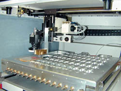 Наиболее популярны в настоящее время биочипы на основе кДНК, ставшие по-настоящему революционной технологией в биомедицине. Остановимся подробнее на их приготовлении, а также на получении и обработке данных с их помощью. Определяющей технологической идеей стало применение стеклянной подложки для нанесения генетического материала, что сделало возможным помещать на нее ничтожно малые его количества и очень точно определять местоположение конкретного вида тестируемой ДНК. Для приготовления биочипов стали использоваться роботы, применяемые прежде в микроэлектронике для создания микросхем (рис. 1). Молекулы ДНК каждого типа создаются в достаточном количестве копий с помощью процесса, называемого амплификацией; этот процесс также может быть автоматизирован, для чего используется специальный робот - умножитель. После этого полученный генетический материал наносится в заданную точку на стекле (на жаргоне такой процесс называется «печать») и химически к стеклу пришивается (иммобилизация). Для иммобилизации генетического материала необходима первичная обработка стекла, а также обработка напечатанного биочипа ультрафиолетом, стимулирующим образование химических связей между стеклом и молекулами ДНК (рис. 2).