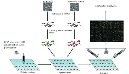 Грубо говоря, из клетки выделяется смесь продуктов работы генов, т. е. РНК различных типов, производимых в определенных условиях. Результатом эксперимента и является знание того, продукты каких именно генов появляются в клетке в условиях, интересующих исследователя. Молекулы каждого типа РНК связываются (в лучшем случае) с единственным типом молекул из иммобилизованных на биочипе. Те молекулы, которые не связались, можно смыть, а для определения того, к каким из иммобилизованных на чипе молекул нашлись «партнеры» в исследуемой клетке, экспериментальная и контрольная РНК метится флуоресцирующими красителями.