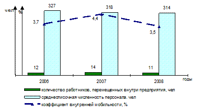 На предприятии практически отсутствует наполнение вакансий из кадрового резерва. Это показывает, что предприятие полностью не использует данный источник подбора (хотя кадровый резерв формируется на некоторые должности). Следовательно, кадровый резерв (в первую внутренний) необходимо совершенствовать в будущем для повышения его экономической отдачи. К 2008 году, по-прежнему, наибольший удельный вес имеют работники, сменившие должность между подразделениями, что свидетельствует о наличии на предприятии доминирующего горизонтального перемещения работников. Это может означать, что недостаточно развита на предприятии политика управления деловой карьерой работников, а также это свидетельствует об отраслевой специфике ограничения вертикальной карьерной лестницы внутри одного подразделения.