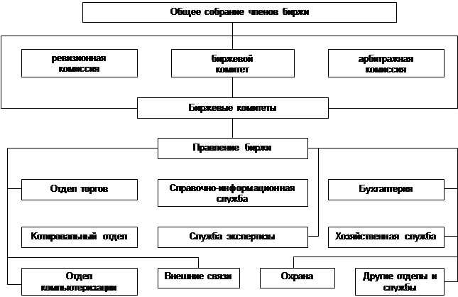 Второй отличительный признак биржи – организация. Биржа – организованный рынок, т.е. в ней есть органы для определенных функций, связанных с управлением, поддержанием порядка, нормировкой биржевых сделок и т.д. Рынок такого устройства не знает. Единственный орган, который свойственен рынку, занимается поддержанием порядка. Продавцы и покупатели на рынке представляют собой большую неорганизованную массу. Но всюду, где рынок поднимается до уровня биржи, появляются органы. Однако эти органы не везде одни и те же. Каждая биржа имеет свое организационное строение, но все имеет по крайней мере биржевой комитет – главный и высший орган биржи.
