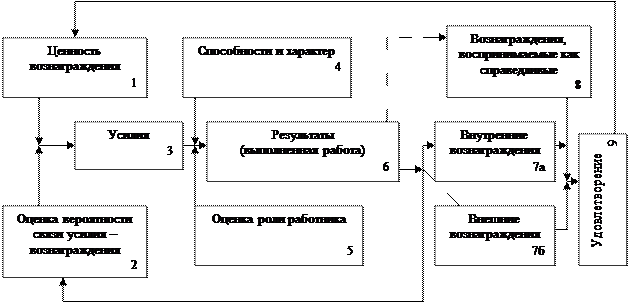 Пунктирная линия между результативностью и внешним вознаграждением означает, что может существовать связь между результативностью какого-либо сотрудника и выдаваемыми ему вознаграждениями. Дело в том, что эти вознаграждения отражают возможности вознаграждения, определяемые руководителем для данного сотрудника и организации в целом. Пунктирная линия между результативностью и вознаграждением, воспринимаемым как справедливое (8), использована для того, чтобы показать, что в соответствии с теорией справедливости, люди имеют собственную оценку степени справедливости вознаграждения, выдаваемого за те или иные результаты. Удовлетворение (9) — это результат внешних и внутренних вознаграждений с учетом их справедливости (8). Удовлетворение является мерилом того, насколько ценно вознаграждение на самом деле (1). Эта оценка будет влиять на восприятие человеком будущих ситуаций.