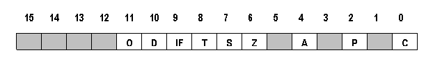 Кроме перечисленных регистров имеются два 16-разрядных регистра: IP - указатель команд и F - регистр флагов. В регистре IP формируется относительный (относительно CS)адрес команды, подлежащей исполнению. В регистре F (рис. 1.2) используются следующие девять разрядов: CF - перенос, PF - четность, AF - вспомогательный перенос, ZF - нулевой результат, SF - знак, TF - пошаговый режим, IF - разрешение прерывания, DF - направление, OF - переполнение. Неиспользованные разряды на рисунке заштрихованы.