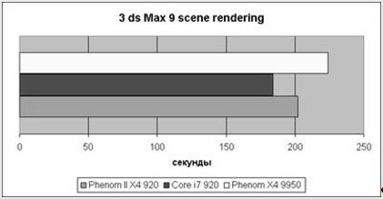 В 3ds Max 9 отставание Deneb от Nehalem уже не столь велико, менее десяти процентов. А вот недостатки Agena проявляются сильнее – десятипроцентный прирост меньше объявленного AMD в пресс-релизе (25%), но уже что-то.