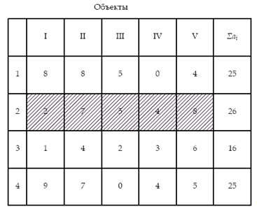 В третью строку под матрицей записываем со своим знаком разницу между продолжительностью работы на данном объекте последней и первой бригад.