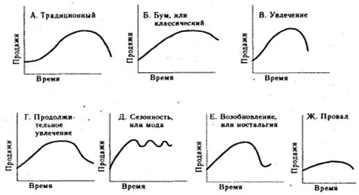 Иногда форма кривой жизненного цикла отклоняется от типичной S-образной. Это происходит в тех случаях, когда товар быстро завоевывает рынок и быстро умирает, либо остается на стадии зрелости в течение очень долгого времени. Некоторые товары достигают упадка, но не умирают, а благодаря мероприятиям по стимулированию сбыта или перепозиционированию на другие сегменты рынка вновь переживают рост.