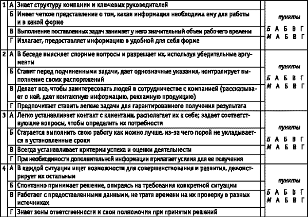 Из предложенных четырех утверждений выберите два, которые НАИБОЛЕЕ (Б) и НАИМЕНЕЕ (М) характеризуют оцениваемого вами сотрудника. Обведите выбранный вариант в соответствующей строке.