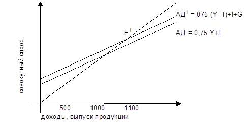Государственные расходы возрастают с нуля до 100, и одновременно на 100 единиц увеличиваются налоги. Кривая АД перемещается вверх на 25 пунктов. Новая кривая совокупного спроса АД1