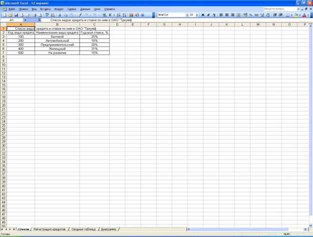 На листе «Список» MS Excel создать таблицу списка видов кредита и ставок по ним в ОАО «Триумф».