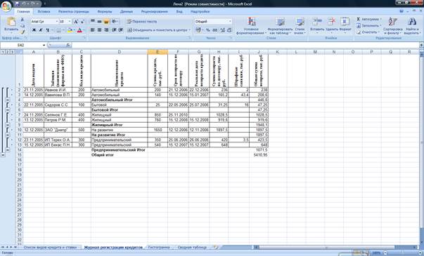 В таблице «Журнала регистрации кредитов» подвести общий итог в журнале по полю «Сумма кредита, тыс. руб.», «Сумма возврата по договору, тыс. руб.», «Штрафные санкции, тыс. руб.», «Общая сумма возврата, тыс. руб.» (Рис.3)