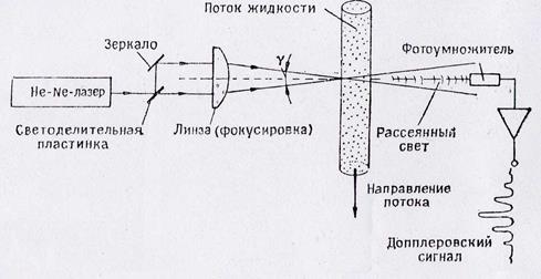 В промышленной измерительной технике требуются очень точные методы определения расхода и скорости потока. При этом допустимые погрешности не должны превышать одного процента, а иногда и одной десятой процента. Довольно точные измерители расхода требуются иногда и в быту (например, газовый счетчик). Недавно появились оптоэлектронные измерители расхода и скорости, работающие па оптическом эффекте Допплера (см. рисунок 2), которые используют особый вид рассеяния света.