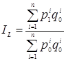 где - количество товаров и услуг, произведенных в базисном году, а - цены товаров и услуг в базисном году, - цены товаров в текущем году. Суммирование производится по всем товарам и услугам, входящих в набор.