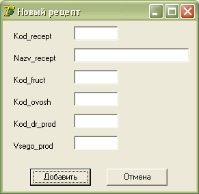 В этом окне будут вводиться данные о новом рецепте. На форме 1-Новый рецепт находятся поля для ввода нового рецепта: Код рецепта, Название рецепта, Код фрукта, Код овоща, Код другого продукта и Всего продуктов для рецепта. Также есть кнопки “Добавить” и “Отмена”. При нажатии на кнопку “Добавить” будет сохранен новый рецепт, а при нажатии на “Отмена” происходит выход в главное меню. Можно изменять любые поля, кроме поля Kod_recepta (всегда проставляется автоматически). Данные будут поступать в таблицу “Рецепты”, в отчеты и справочники.