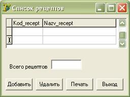 При выборе подпункта “Список рецептов” на форму 2-Список рецептов будет выведен список рецептов с их кодами и названиями в виде таблицы. На форме есть кнопки “Добавить ”, “Удалить”, “Печать” и “Выход”. При нажатии на кнопку “Добавить” появится форма 3-Добавление рецепта в список. Эта форма содержит поле для ввода названия рецепта и кнопки “ОК” и “Отмена”. При нажатии на ОК рецепт добавляется в список, при нажатии на Отмена происходит возвращение на форму 2. При нажатии на кнопку “Удалить” происходит удаление рецепта из списка. Эта форма содержит две кнопки “ОК” и “Отмена”. Кнопка “Печать” позволяет распечатать список рецептов для отчетности. Кнопка “Выход” производит выход в главное меню. На форме также находится поле для подсчета общего числа рецептов.
