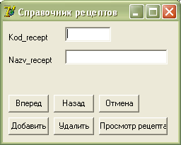 При нажатии на “Вперед” происходит переход на рецепт со следующим кодом. При нажатии на кнопку “Назад” переход на рецепт с предыдущим кодом. При нажатии на кнопку “Отмена” окно закрывается и мы попадаем в главное меню.