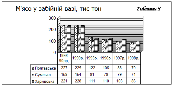 Зокрема на ринку зерна склалася наступна ситуація. Як вже зазначалося, Північно-Східний економічний район має всі природні передумови для вирощування високоякісної пшениці та інших зернових культур. Та не зважаючи на це, у 1999р. імпорт зерна у регіоні для забезпечення населення хлібопродуктами склав 153 тис тон. (Полтавська обл. – 13 тис тон, Сумська обл – 40 тис тон та Харківська – 100 тис тон). Полтавська область має найменший показник іморту зернових в Україні, а Харківська – що ненайбільший. Ця диференціація, безумовно, пов¢язана з високим рівнем урбанізації та значної частки промисловості у господарстві Харківської області.