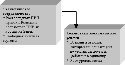 Участие в международных экономических связях дает преимущества всем вовлеченных в них сторонам, которых ни одна из них не смогла быть достичь в одиночку. Кроме того, экономическая интеграция представляет собой эффективный способ укрепления международной стабильности. Изучение потока инвестиций в Россию дает ясную картину того, что прямые иностранные инвестиции только начинают помогать России интегрироваться в паневропейское экономическое сотрудничество в той степени, в какой она интегрирована со странами бывшего СССР. Все ещё скромные размеры притока прямых иностранных инвестиций в Россию, даже на фоне таких крупных инвестиционных сделок как, покупка British Petroleum ТНК, объясняются недостатком законодательства в сфере деловой активности, непоследовательном применении законов, высоким уровнем бюрократизма и коррупции, что приводило к тому, что потенциальные иностранные инвесторы держались вдали от российских границ.