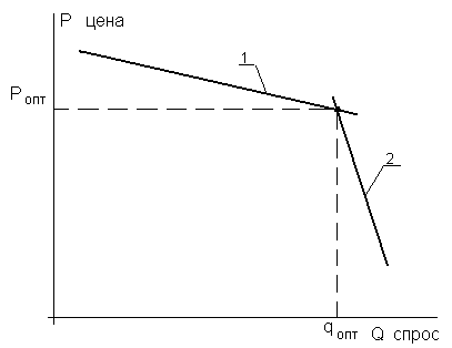 Рисунок 8 – Кривая спроса: 1-более эластичный спрос; 2 – менее эластичный спрос; Ропт