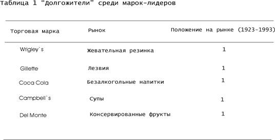 Первенство даёт марки возможность занять в сознании потребителей твёрдую позицию ещё до того, как на рынке начнётся конкуренция. Кроме того, он позволяет обеспечить приверженность к ней как к потребителю, так и посредников. Как видно из табл. 1 некоторые марки-пионеры в своих категориях товара, такие как Wrigley’s, Gillette и Coca-Cola, удерживают лидерство уже более 70-ти лет. И всё же выход первым на рынок с каким-либо уникальным предложением ещё не гарантирует успеха. Чтобы добиться его компания должна проводить продолжительные маркетинговые исследования и быть способной противостоять нажиму конкурентов. Когда фирма занимает какую-либо незанятую рыночную нишу, как это было, например, в случае с компаниями BodyShop, Tierack и SockShop, она, как правило, обеспечивает себе лишь кратковременную прибыль. Настоящие испытания начинаются после того, как на рынок выходят конкуренты, производящие аналогичный товар (и нередко обладающие большими ресурсами).