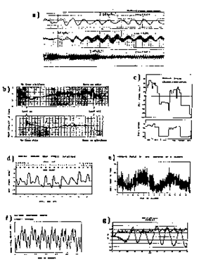 Рис. 4.7.1 Избранные диаграммы, показывающие действие циклических сил в морских конструкциях: a) Напряжения в корпусе танкера вызванные волнами в трех различных состояниях моря; b) Колебания в прибрежных кранах поднимающих грузы с и на транспортные корабли; c) Низкочастотный изгиб корпуса, вызванный изменением распределения груза в танкере; d) Ежедневные деформации в судне, происходящие из-за воздействия солнечного света; e) Растяжение швартовочного троса у дрейфующего танкера пришвартованного носом к рейдовому причалу; f) Напряжения в вале гребного винта небольшого рыболовного судна; g) Циклические силы действующие на элемент вызванные вихрем (моделирование на ЭВМ).